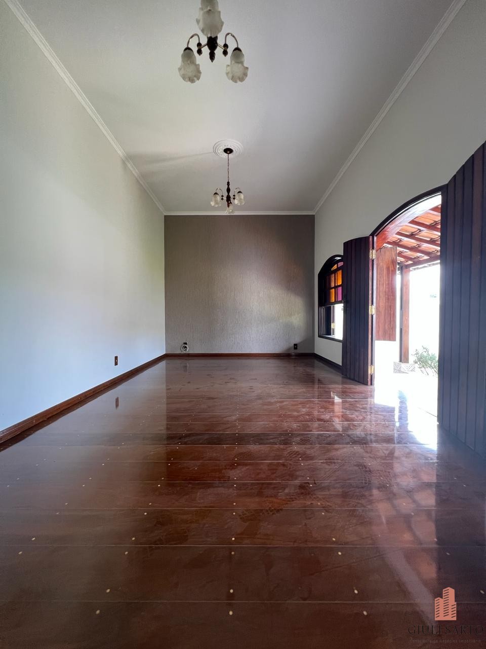 Sala com varandão em 3 ambientes com pé direito alto