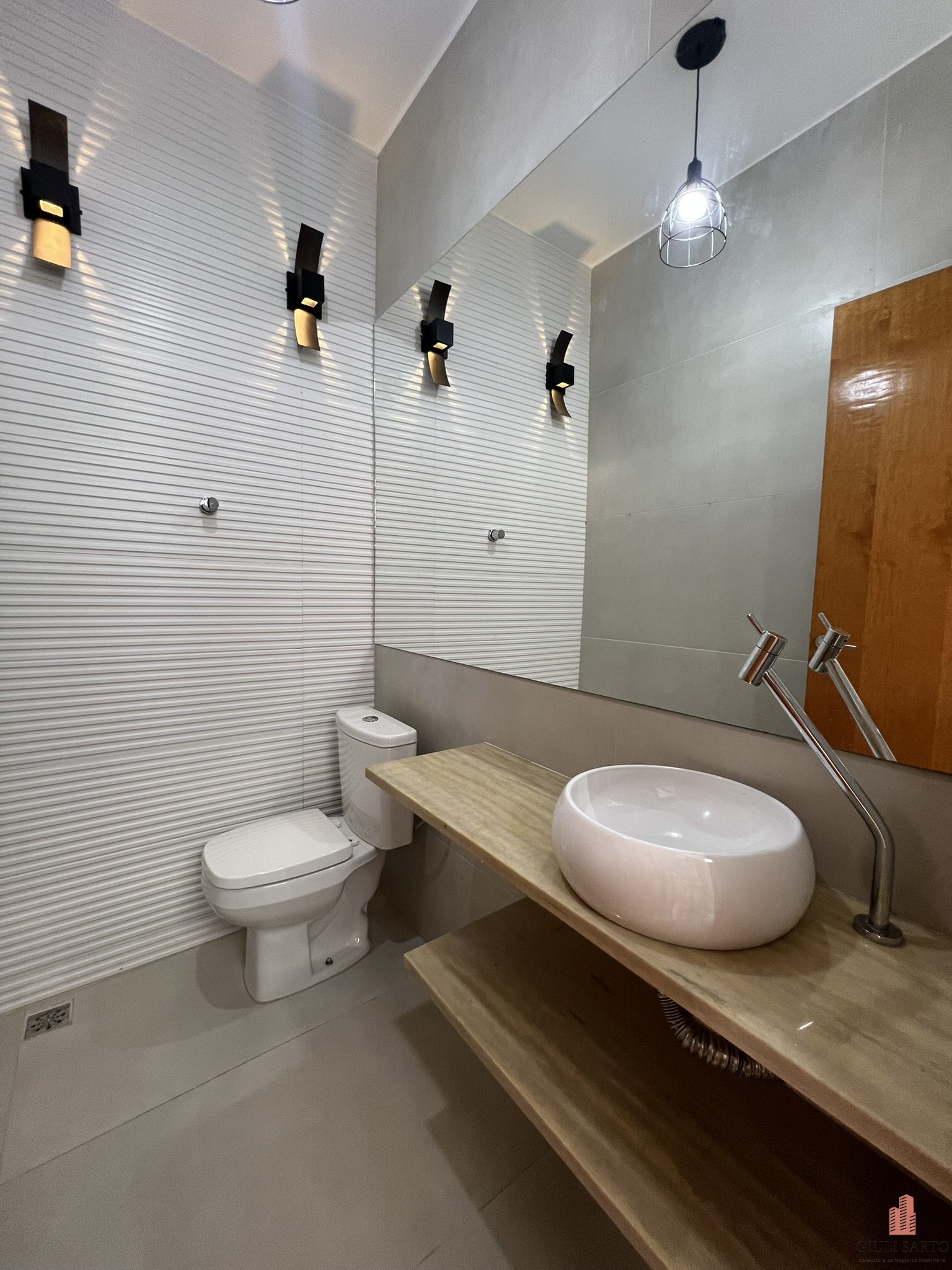 * Sala de estar aconchegante com adega e lavabo planejado