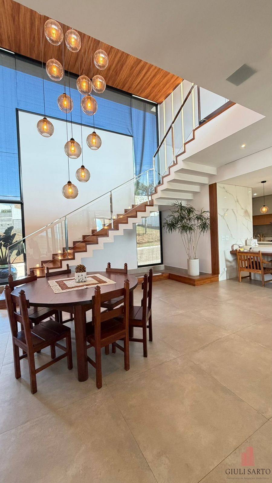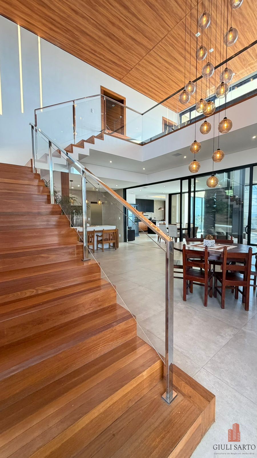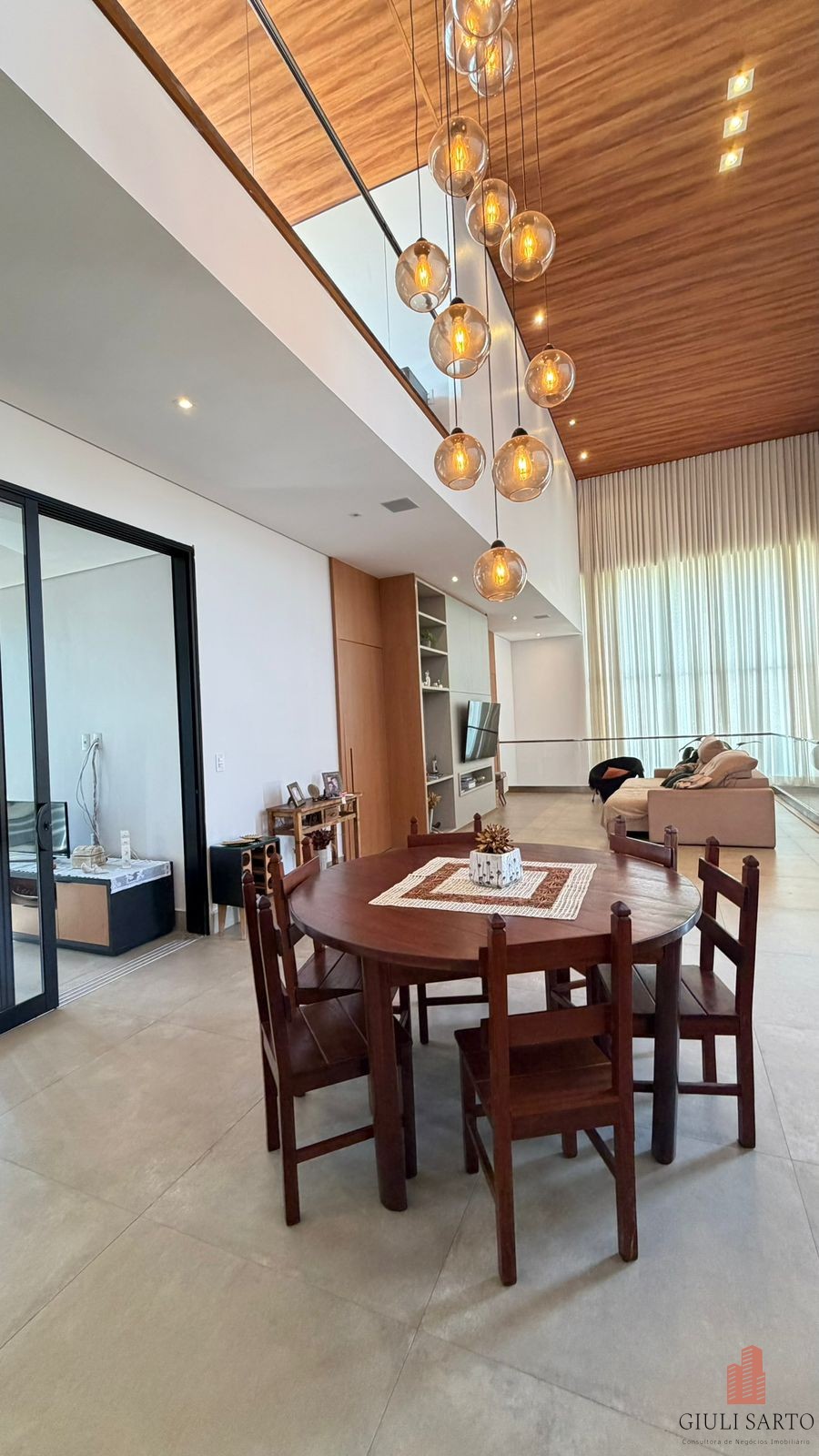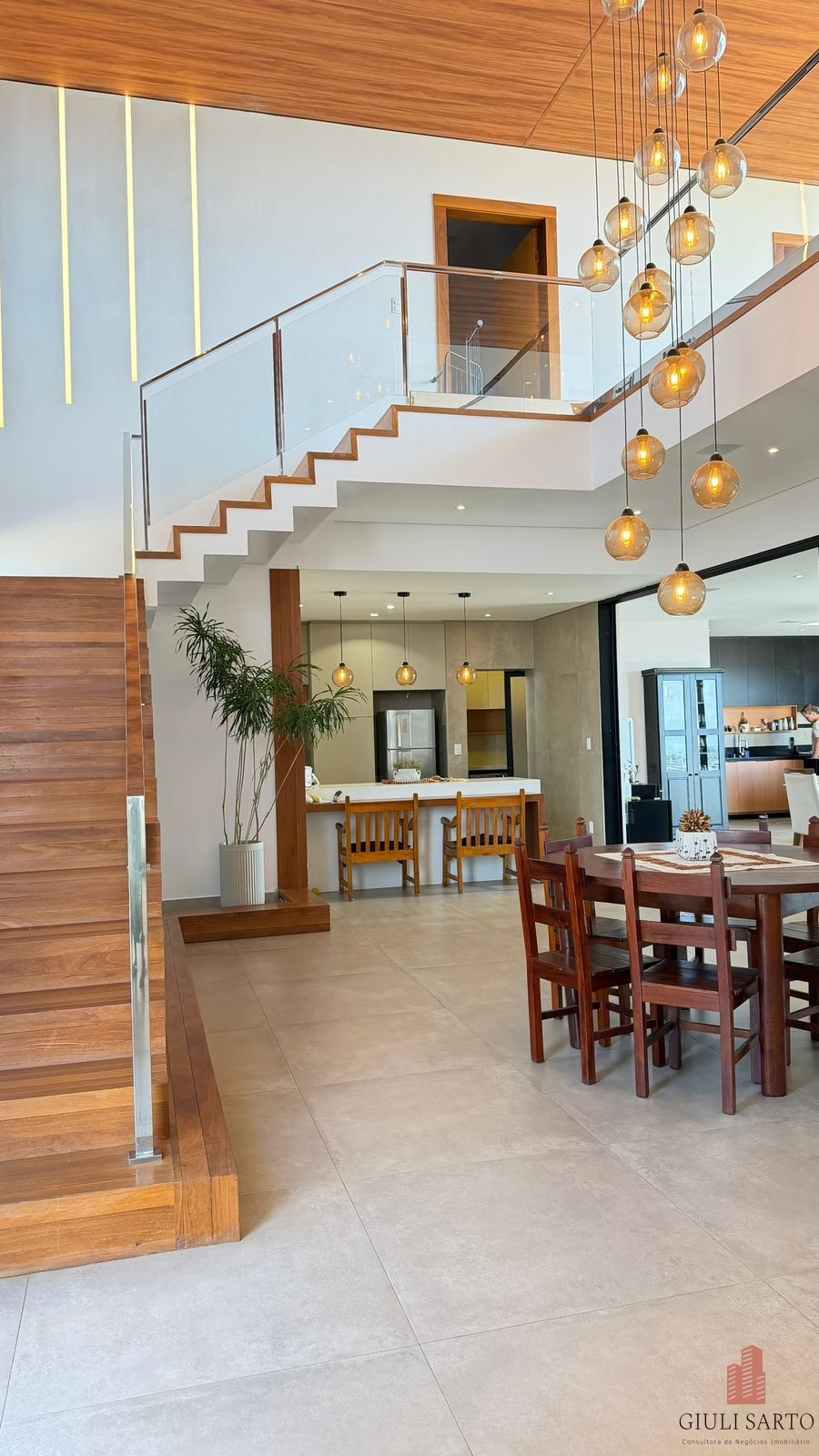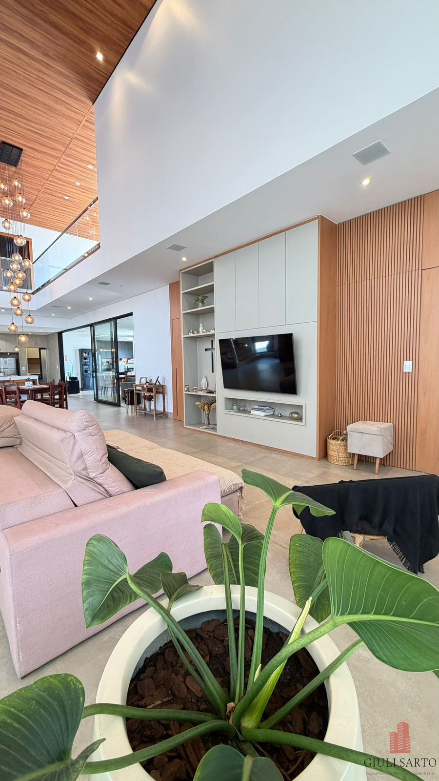 Fachada com paisagismo, escada em pedra iluminada e porta pivotante de 6 m. Sala ampla para dois ambientes com pé-direito de 8 m, esquadrias em alumínio, cortinas automatizadas, teto em madeira vinílica e som embutido.