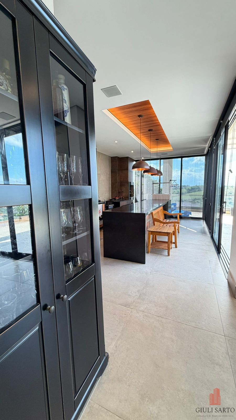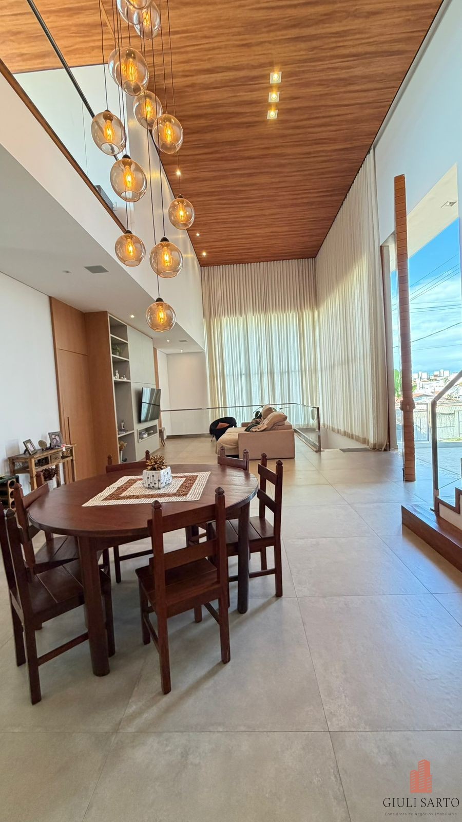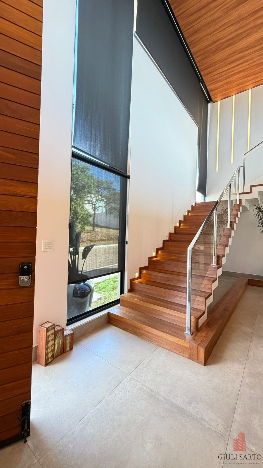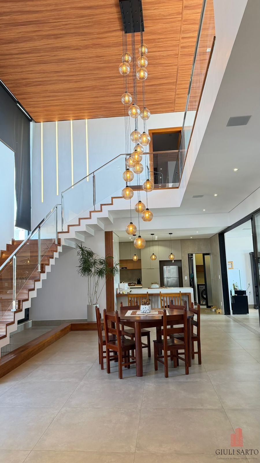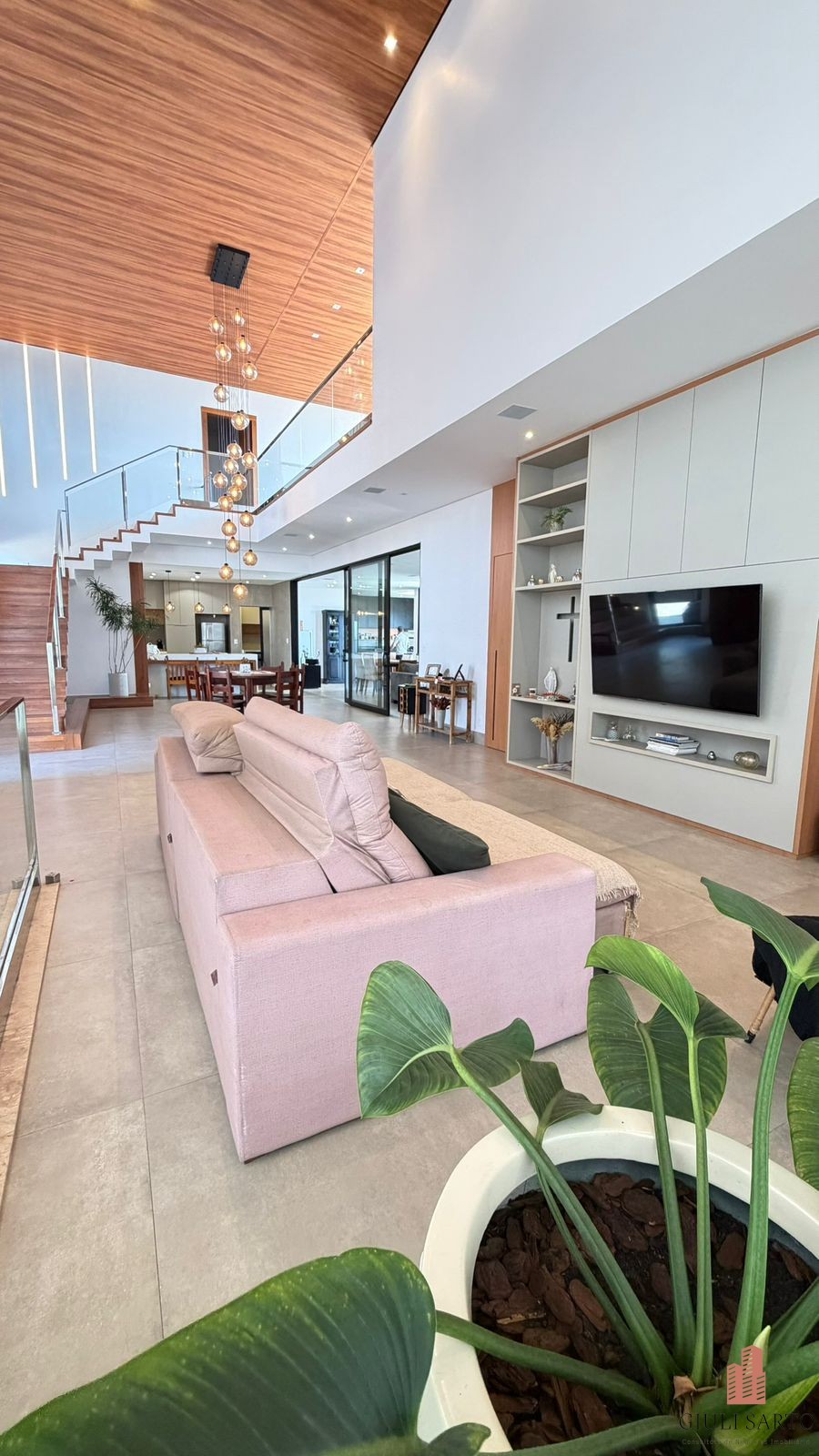 Fachada com paisagismo, escada em pedra iluminada e porta pivotante de 6 m. Sala ampla para dois ambientes com pé-direito de 8 m, esquadrias em alumínio, cortinas automatizadas, teto em madeira vinílica e som embutido.
