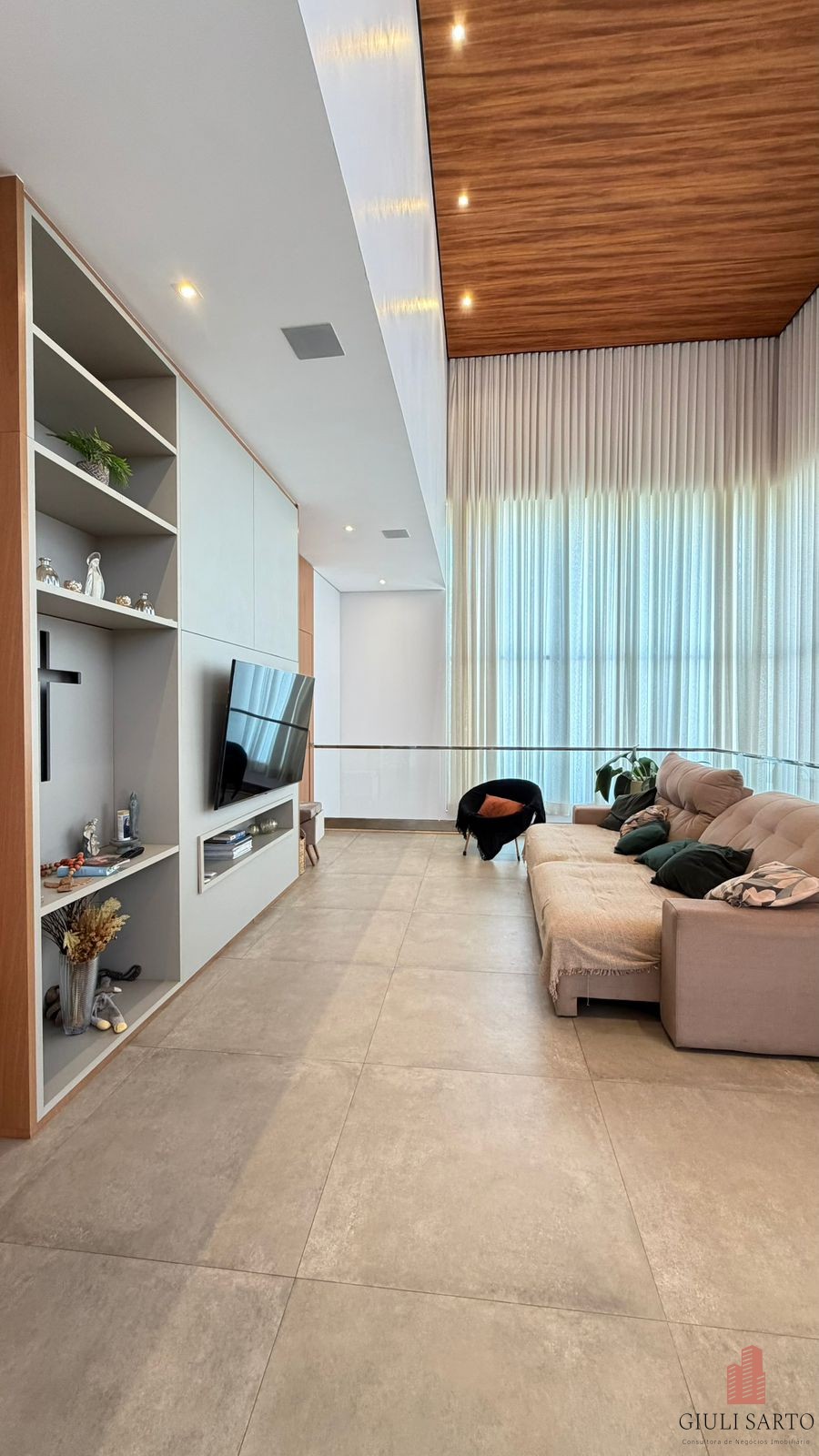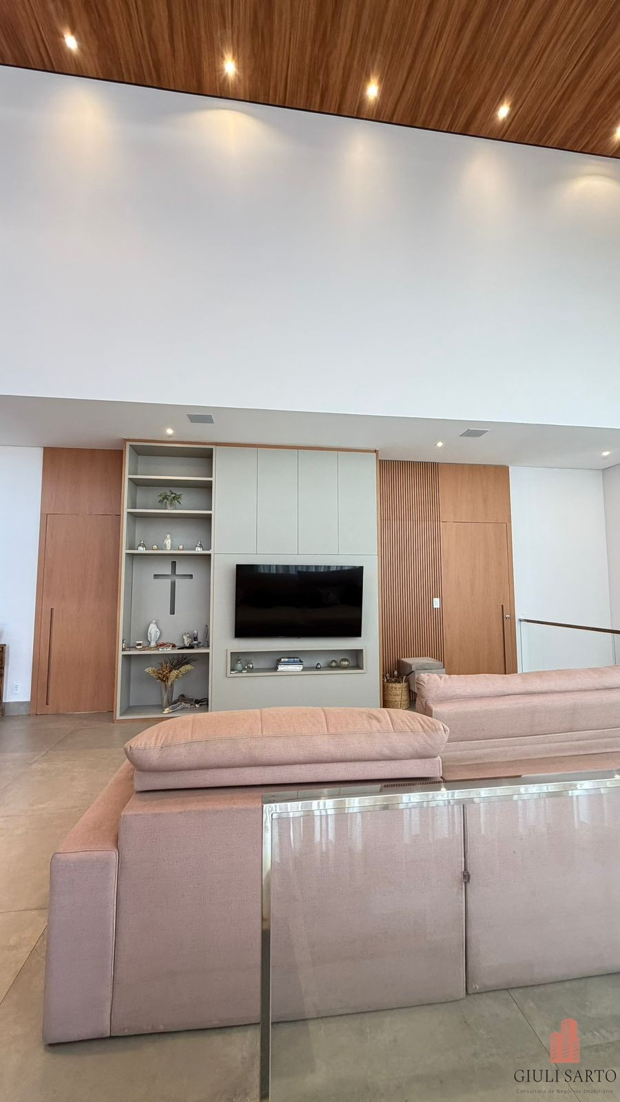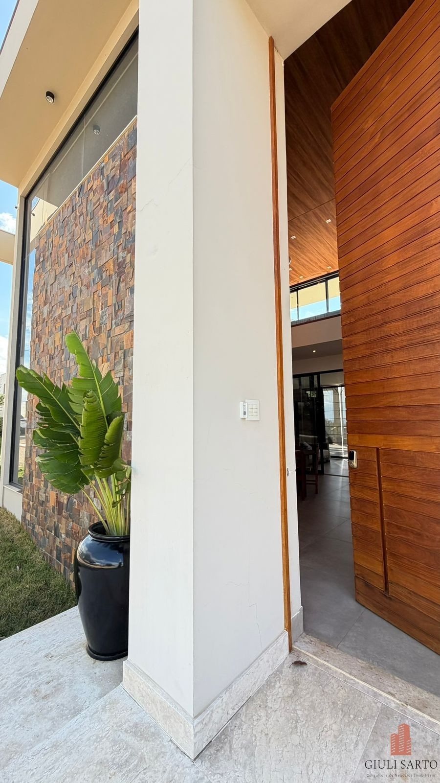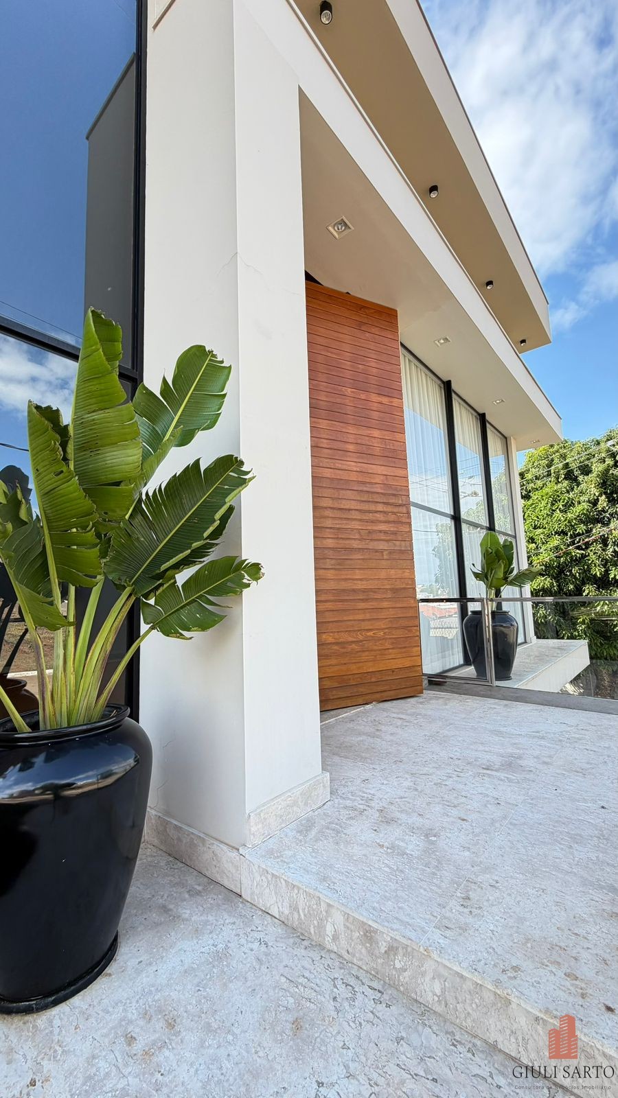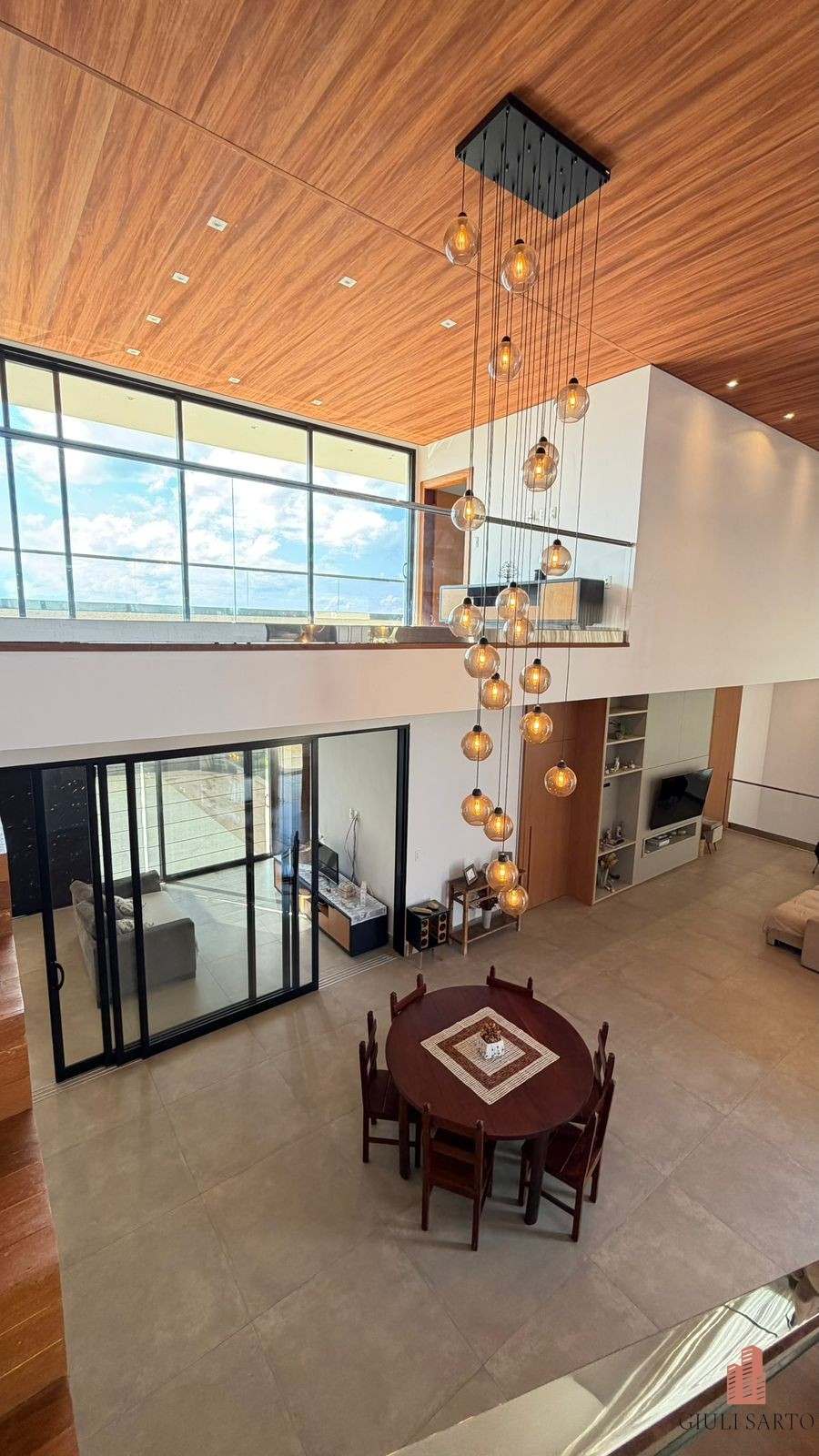 Fachada com paisagismo, escada em pedra iluminada e porta pivotante de 6 m. Sala ampla para dois ambientes com pé-direito de 8 m, esquadrias em alumínio, cortinas automatizadas, teto em madeira vinílica e som embutido.