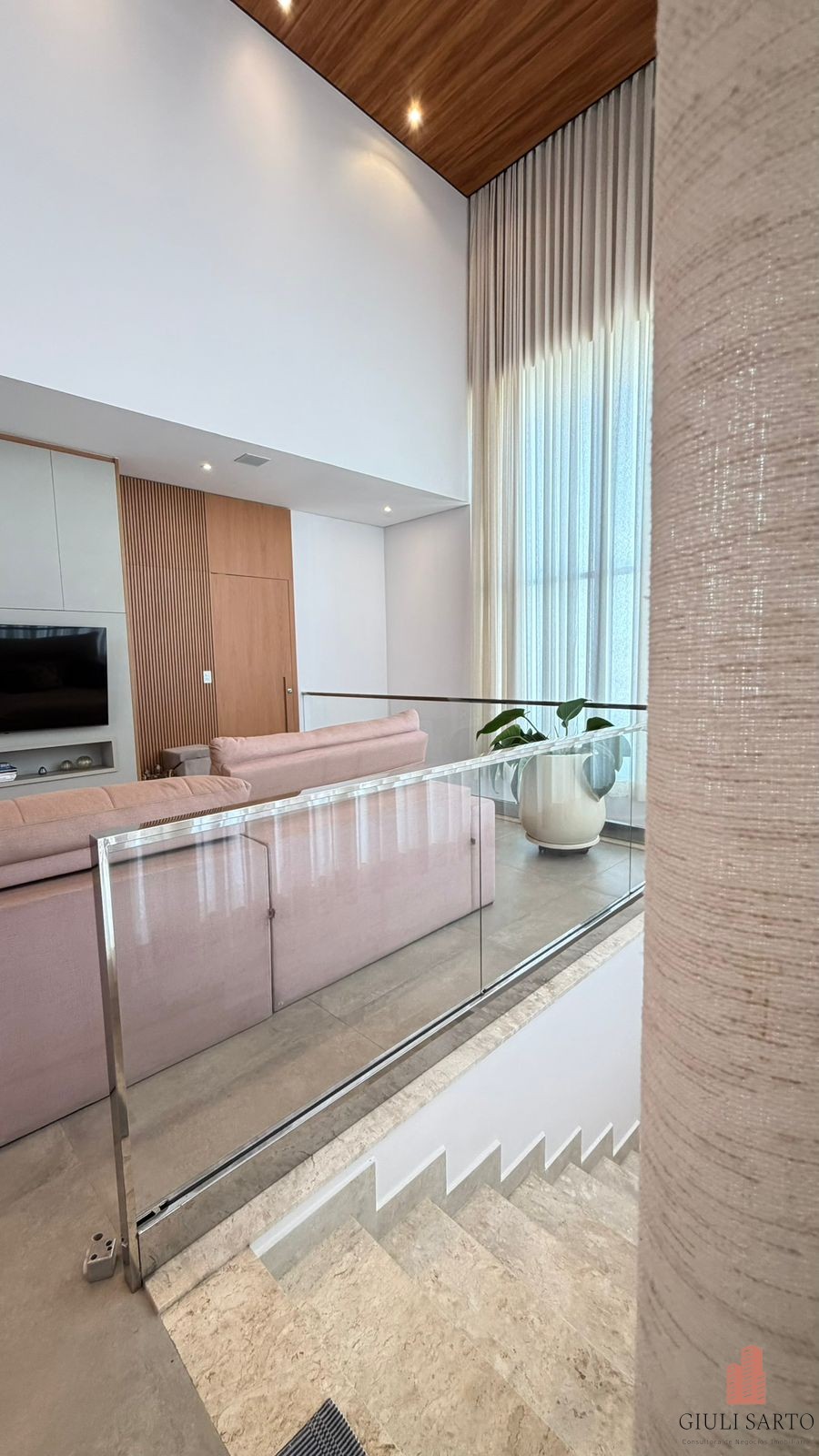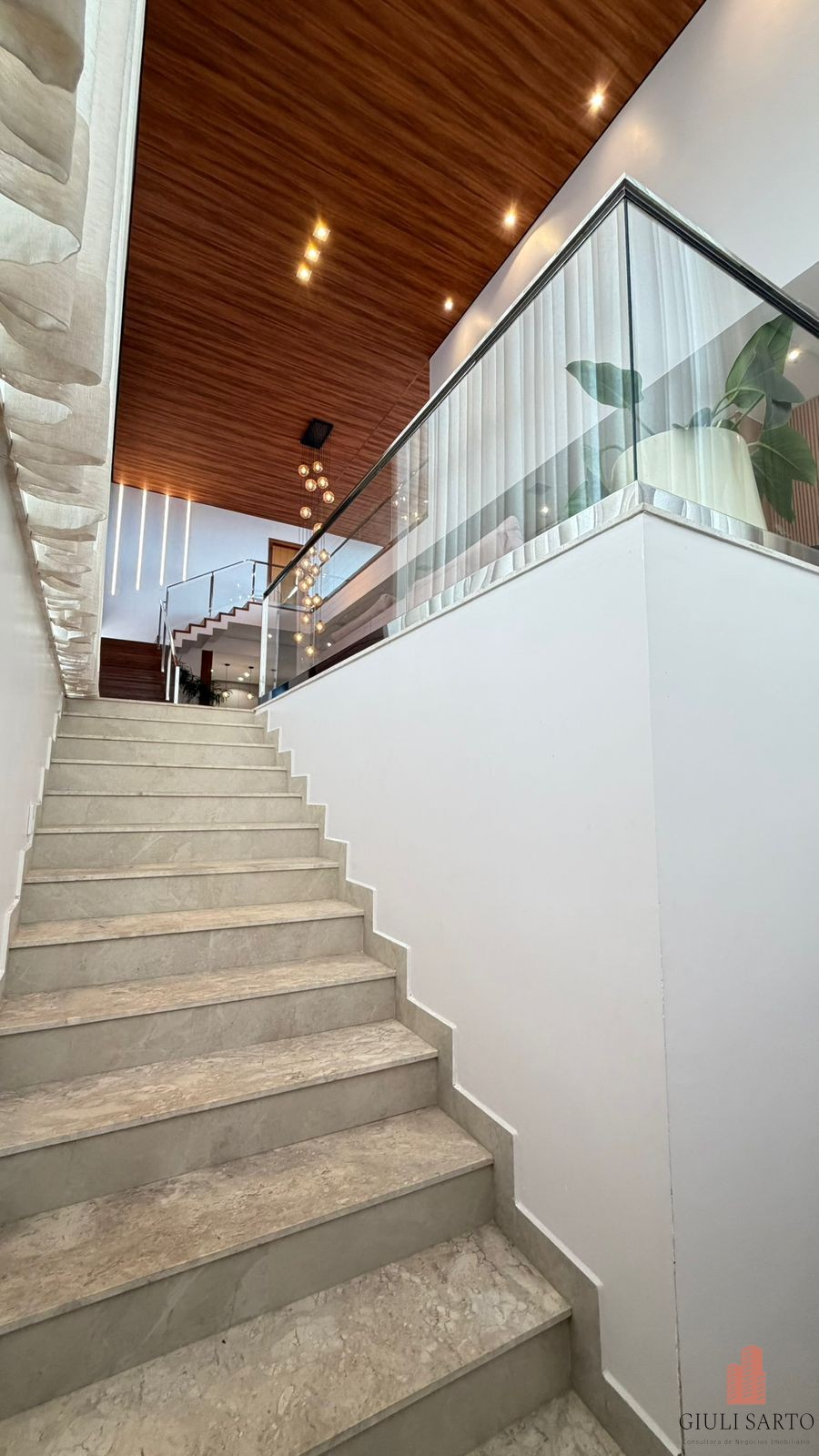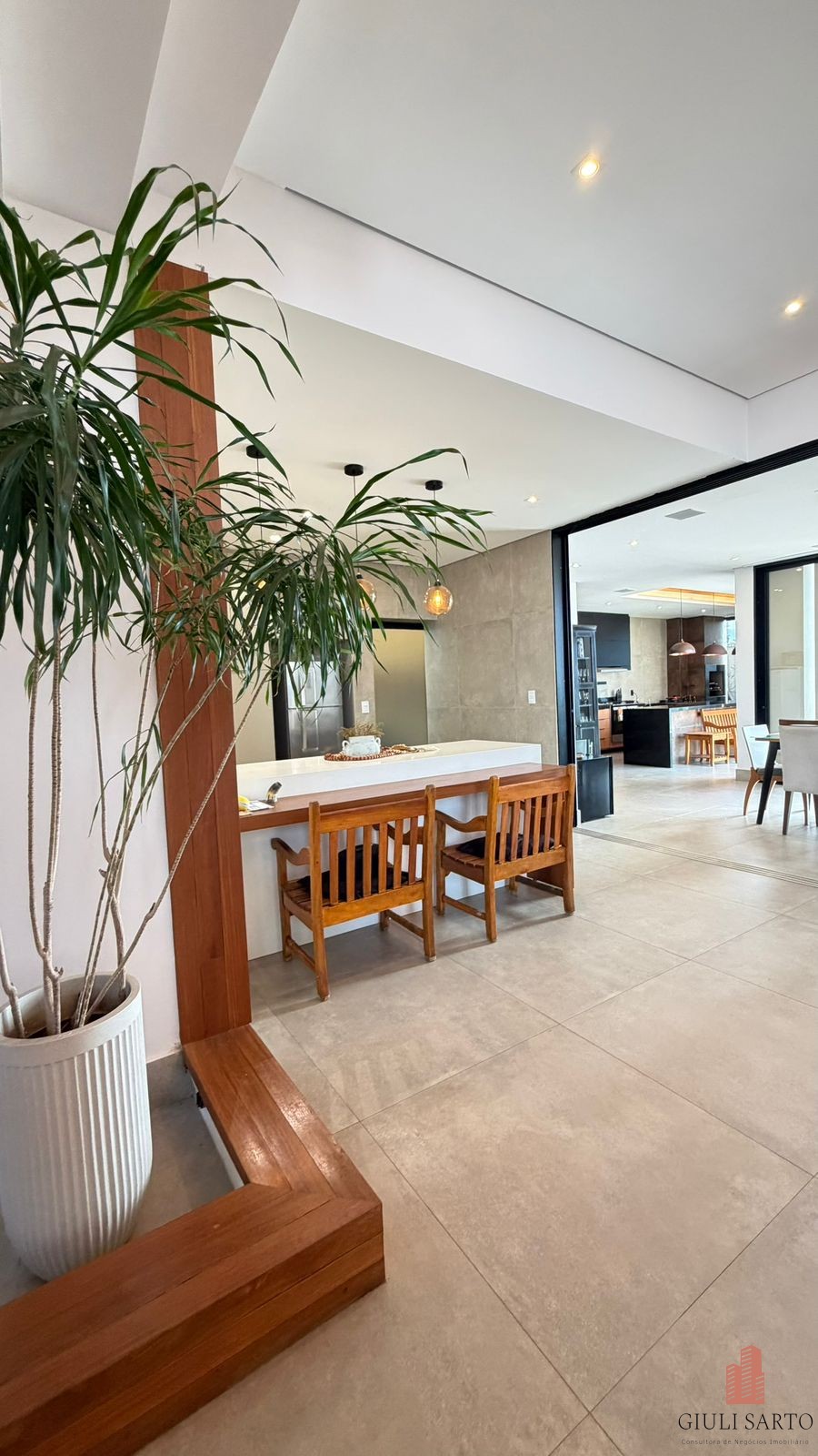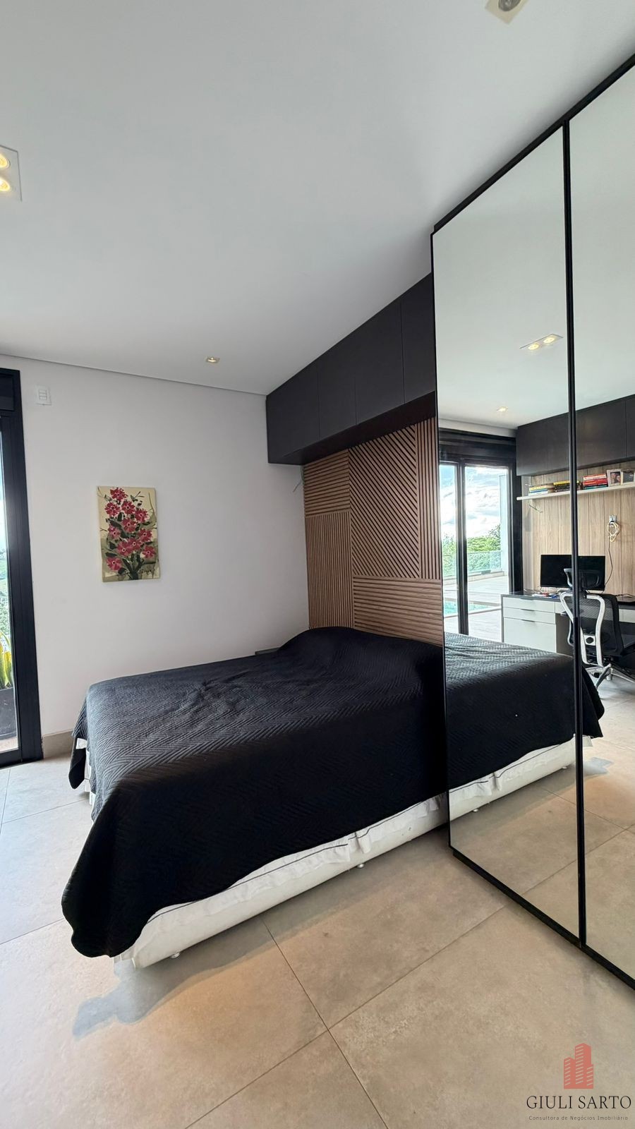 Fachada com paisagismo, escada em pedra iluminada e porta pivotante de 6 m. Sala ampla para dois ambientes com pé-direito de 8 m, esquadrias em alumínio, cortinas automatizadas, teto em madeira vinílica e som embutido.