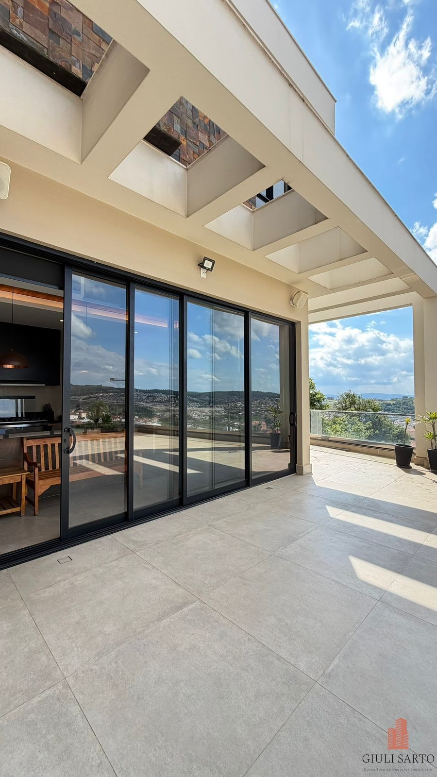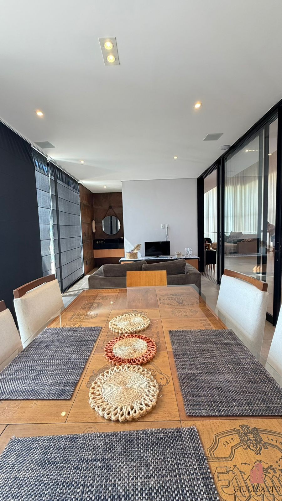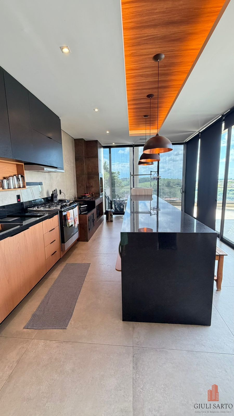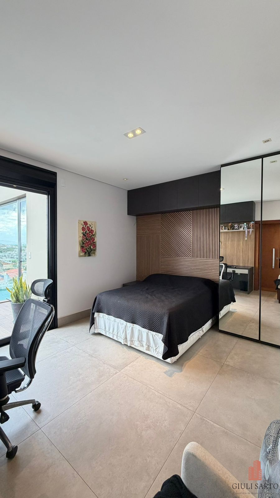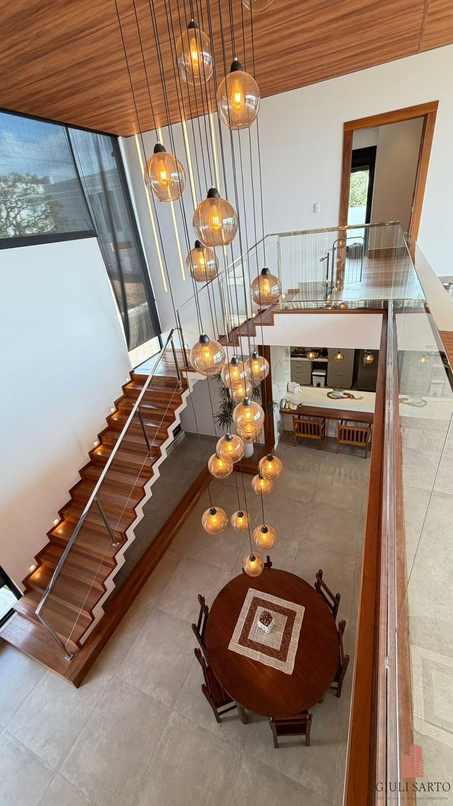 Fachada com paisagismo, escada em pedra iluminada e porta pivotante de 6 m. Sala ampla para dois ambientes com pé-direito de 8 m, esquadrias em alumínio, cortinas automatizadas, teto em madeira vinílica e som embutido.