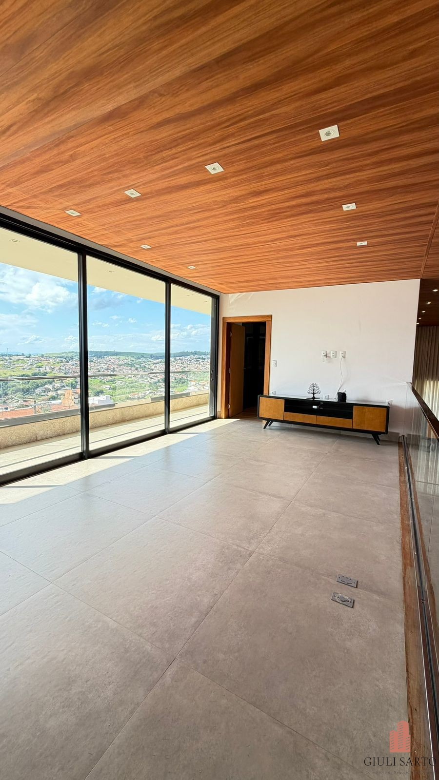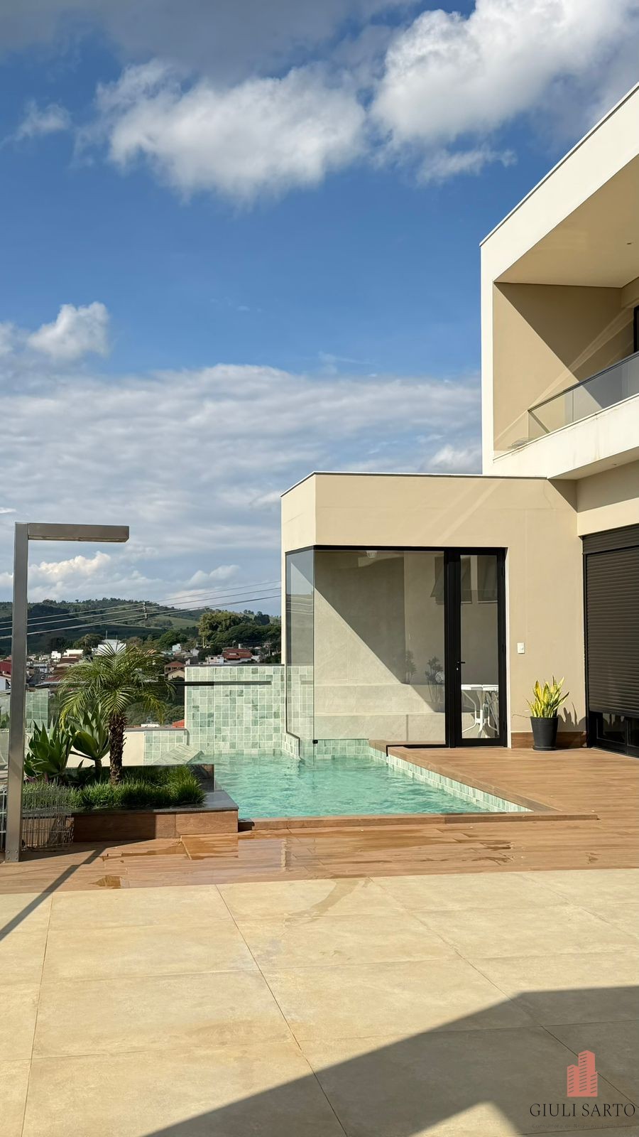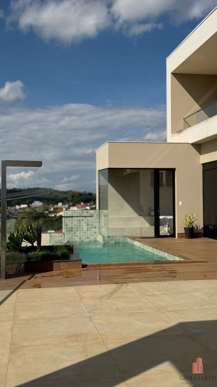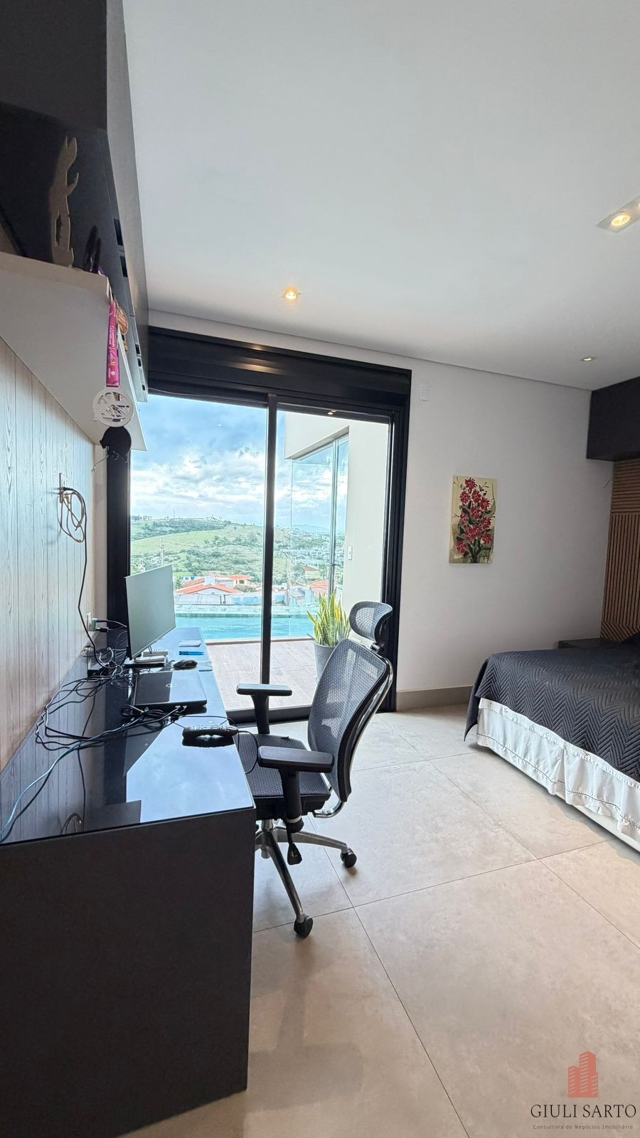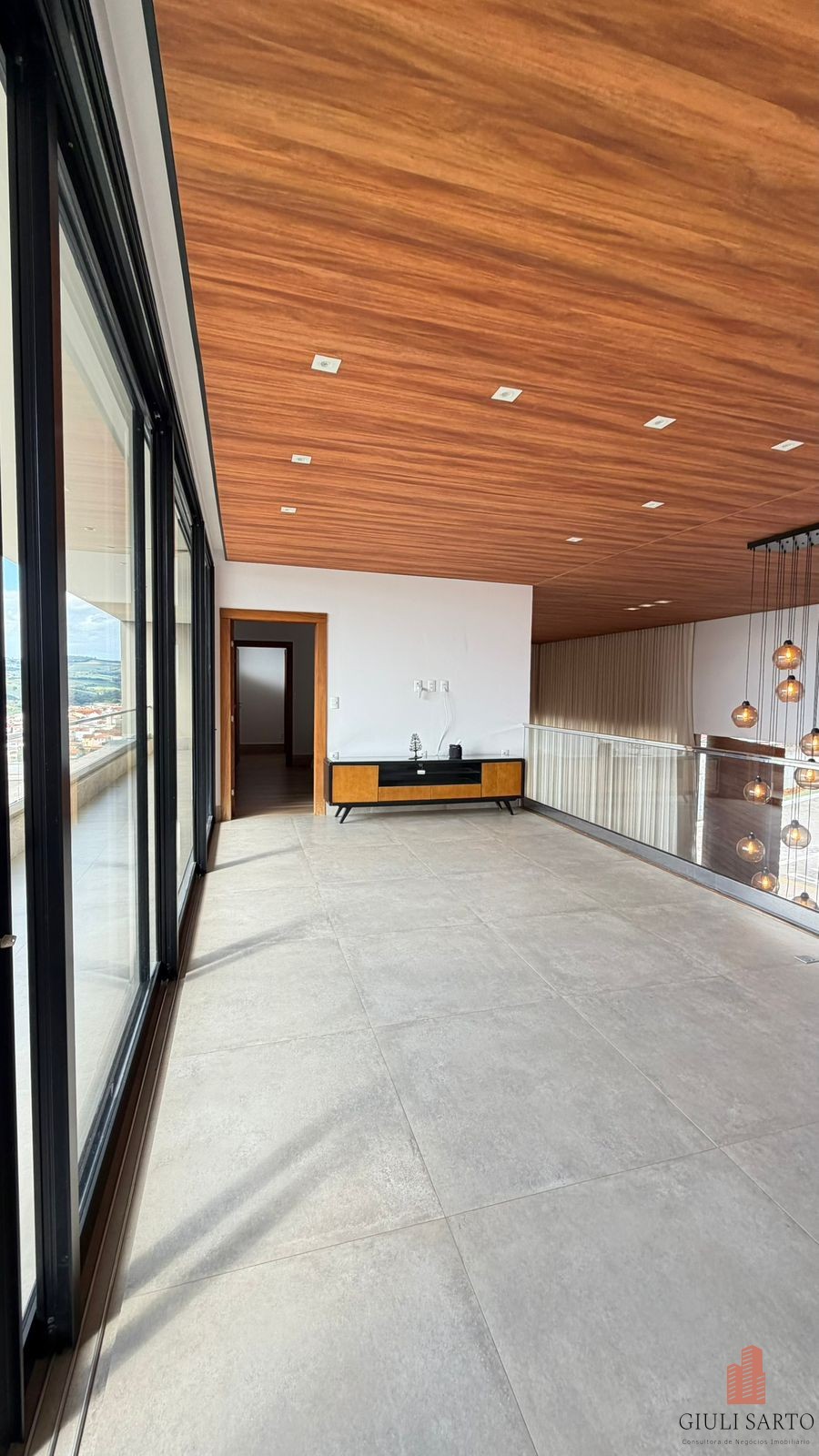 Fachada com paisagismo, escada em pedra iluminada e porta pivotante de 6 m. Sala ampla para dois ambientes com pé-direito de 8 m, esquadrias em alumínio, cortinas automatizadas, teto em madeira vinílica e som embutido.