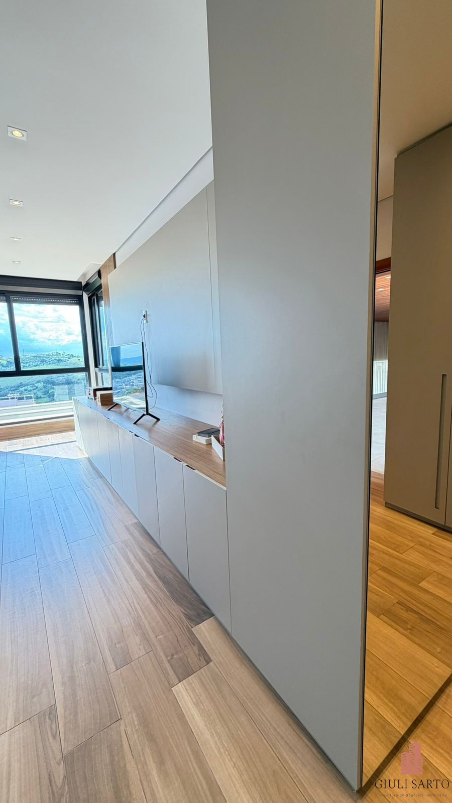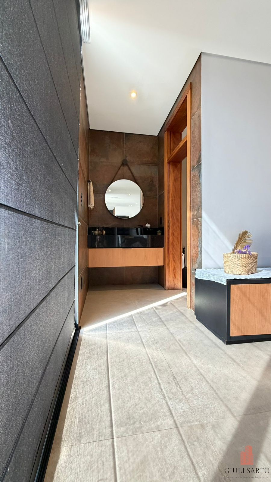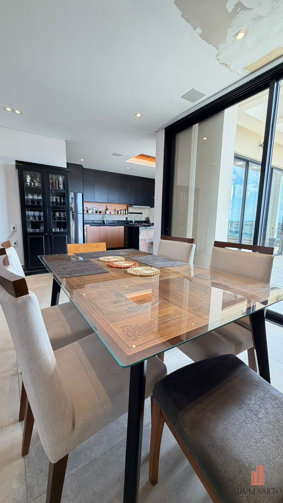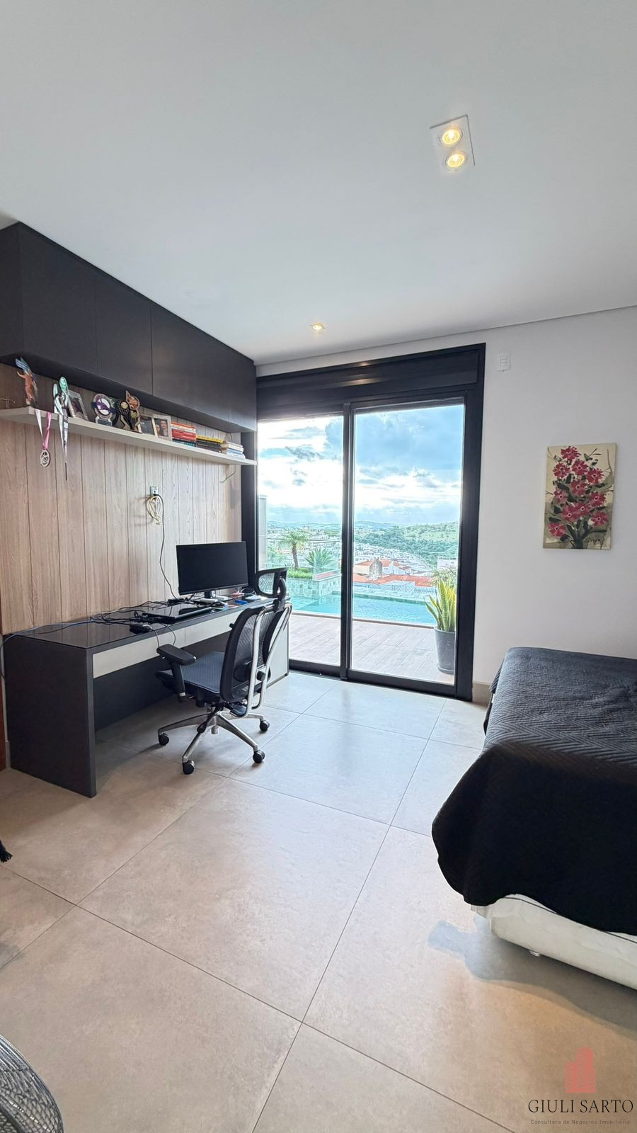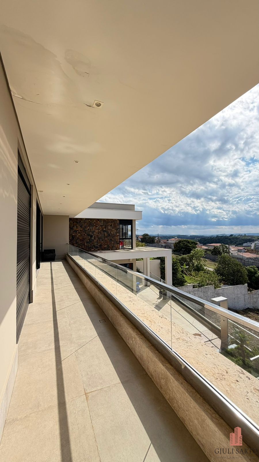 Fachada com paisagismo, escada em pedra iluminada e porta pivotante de 6 m. Sala ampla para dois ambientes com pé-direito de 8 m, esquadrias em alumínio, cortinas automatizadas, teto em madeira vinílica e som embutido.