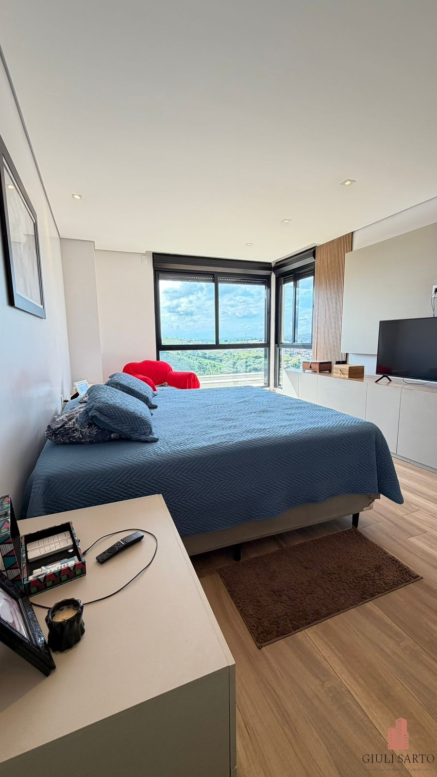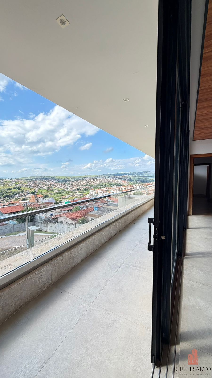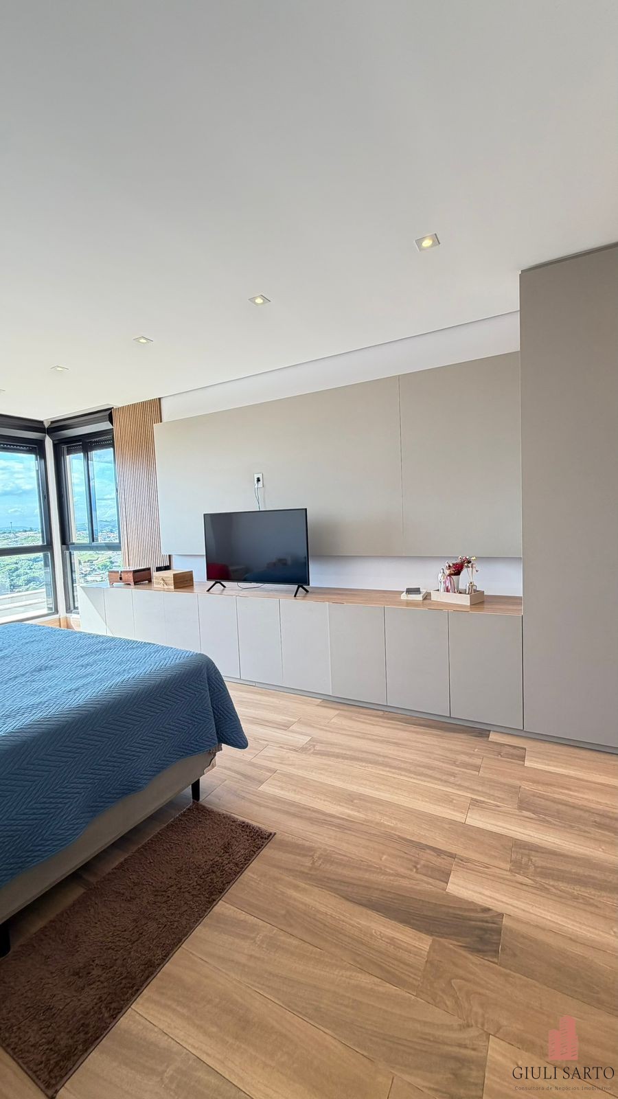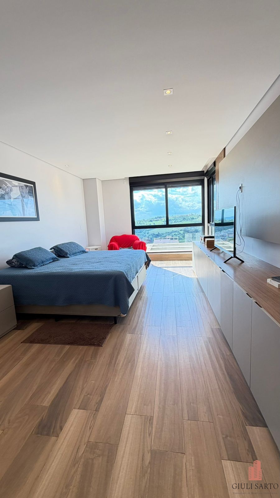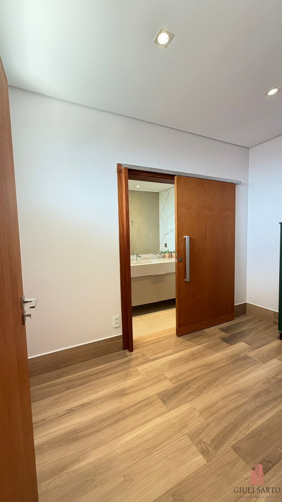 Fachada com paisagismo, escada em pedra iluminada e porta pivotante de 6 m. Sala ampla para dois ambientes com pé-direito de 8 m, esquadrias em alumínio, cortinas automatizadas, teto em madeira vinílica e som embutido.