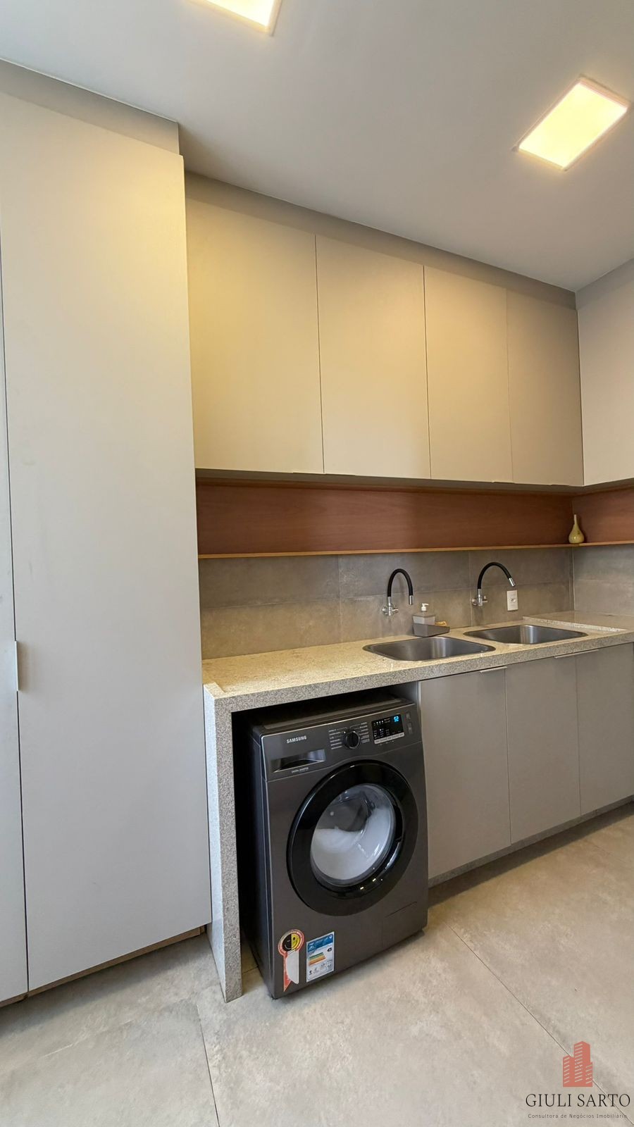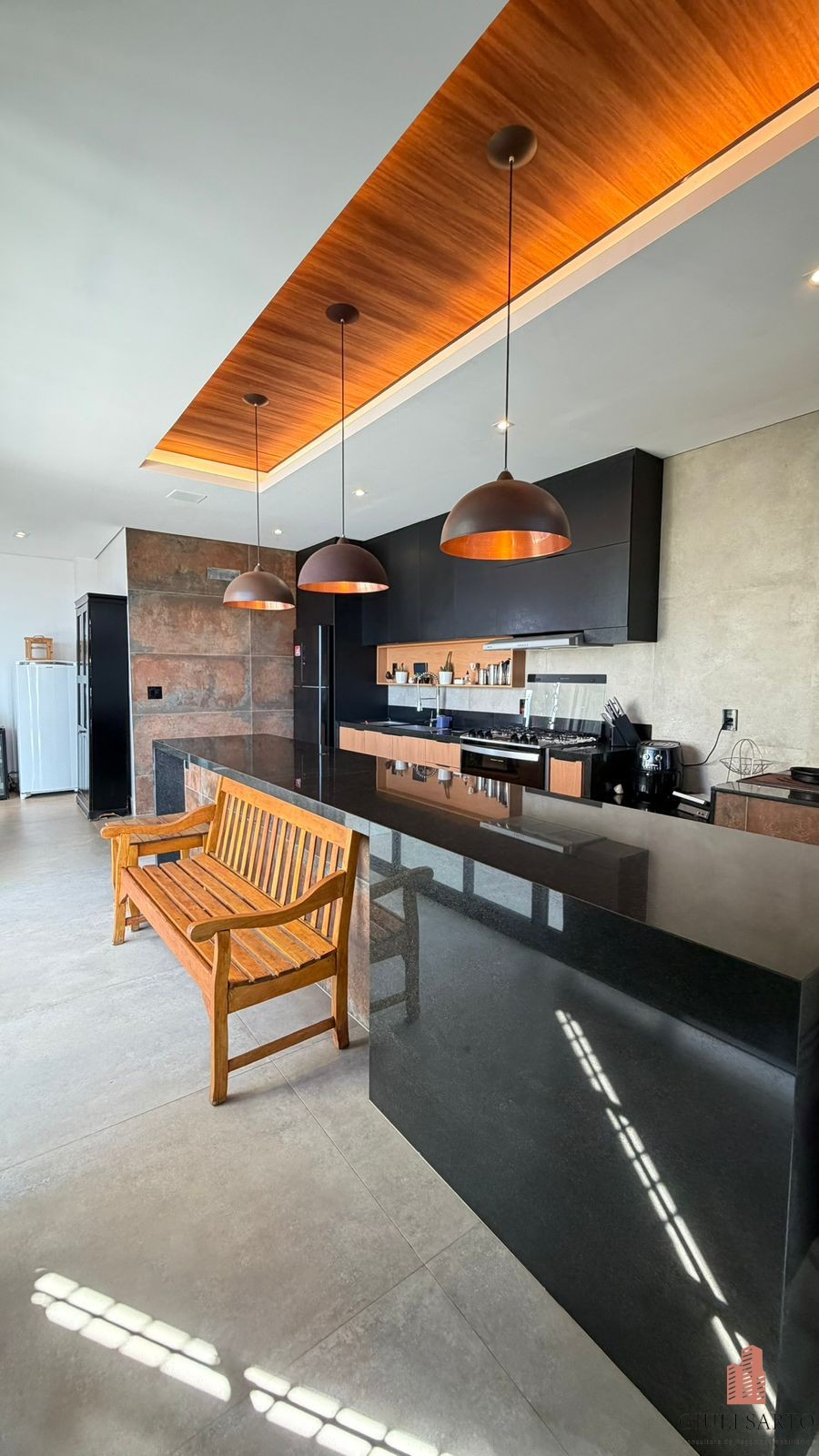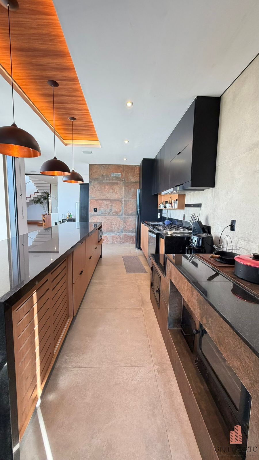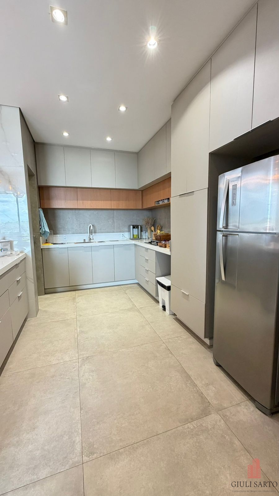 Cozinha americana planejada com despensa.