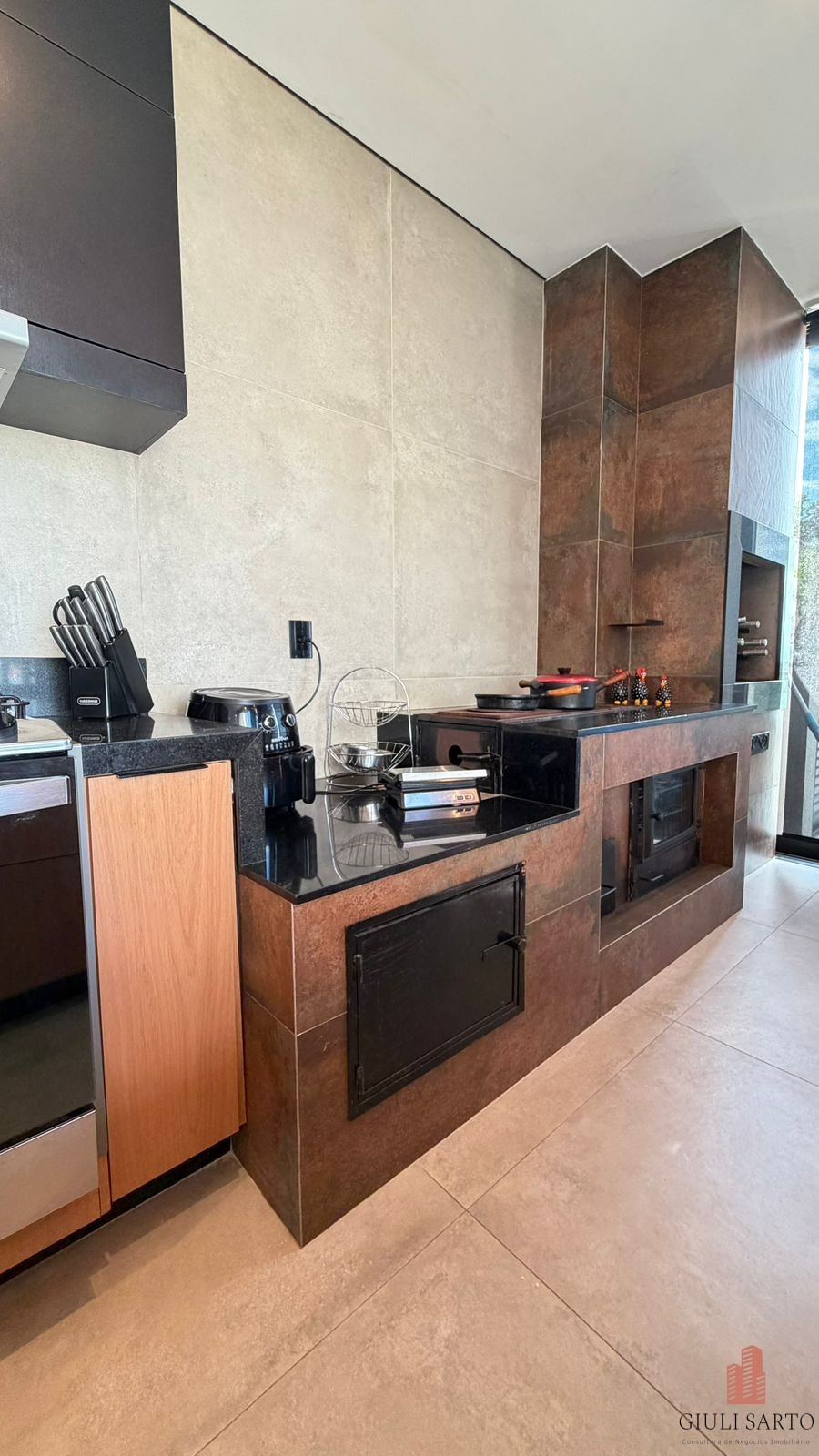 Sala externa integrada e área gourmet completa com churrasqueira e fogão à lenha.