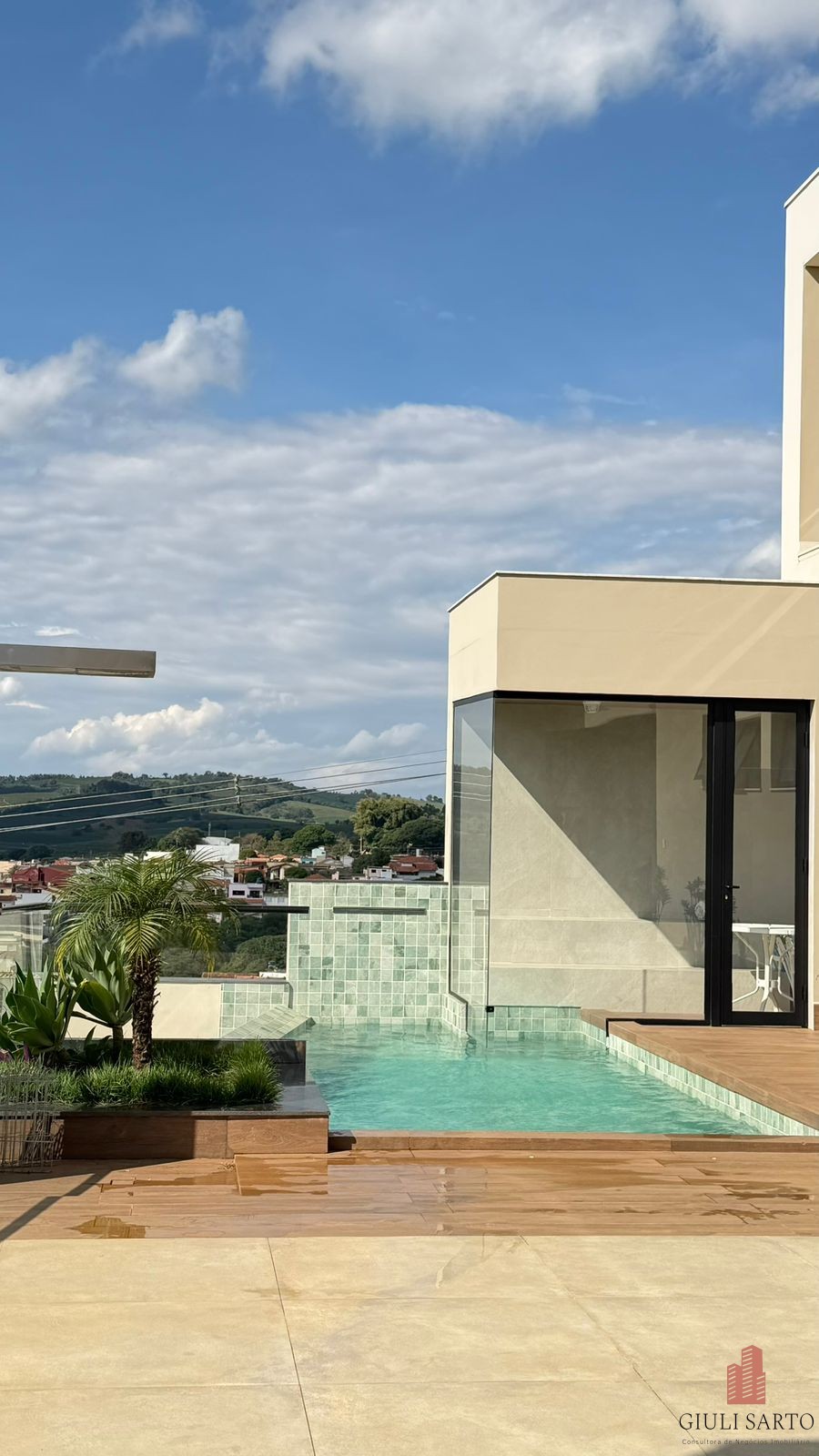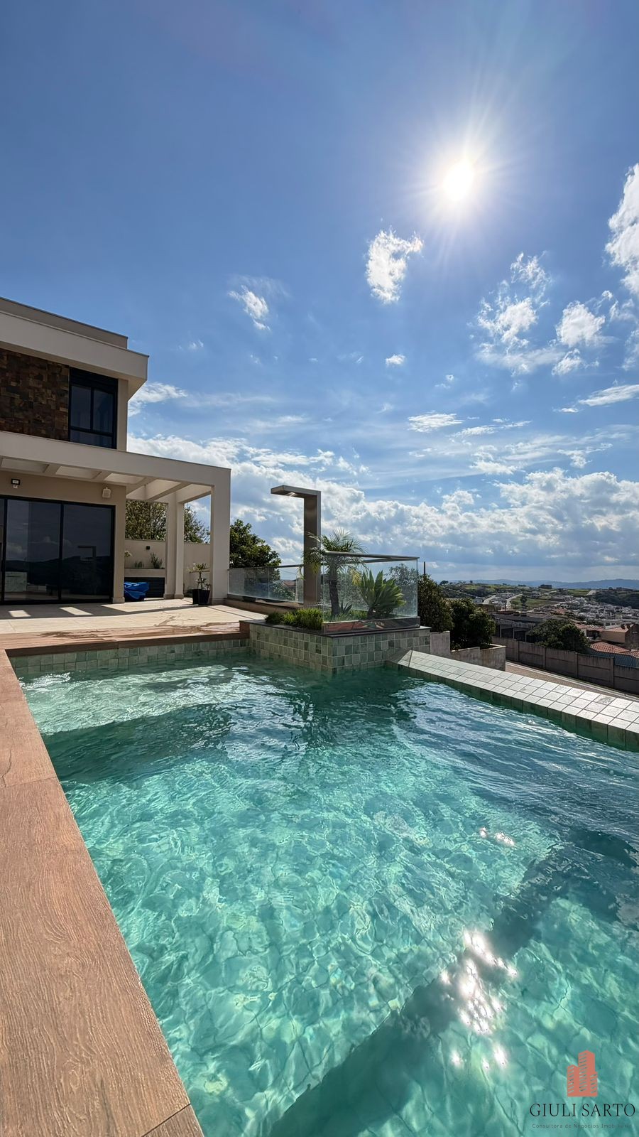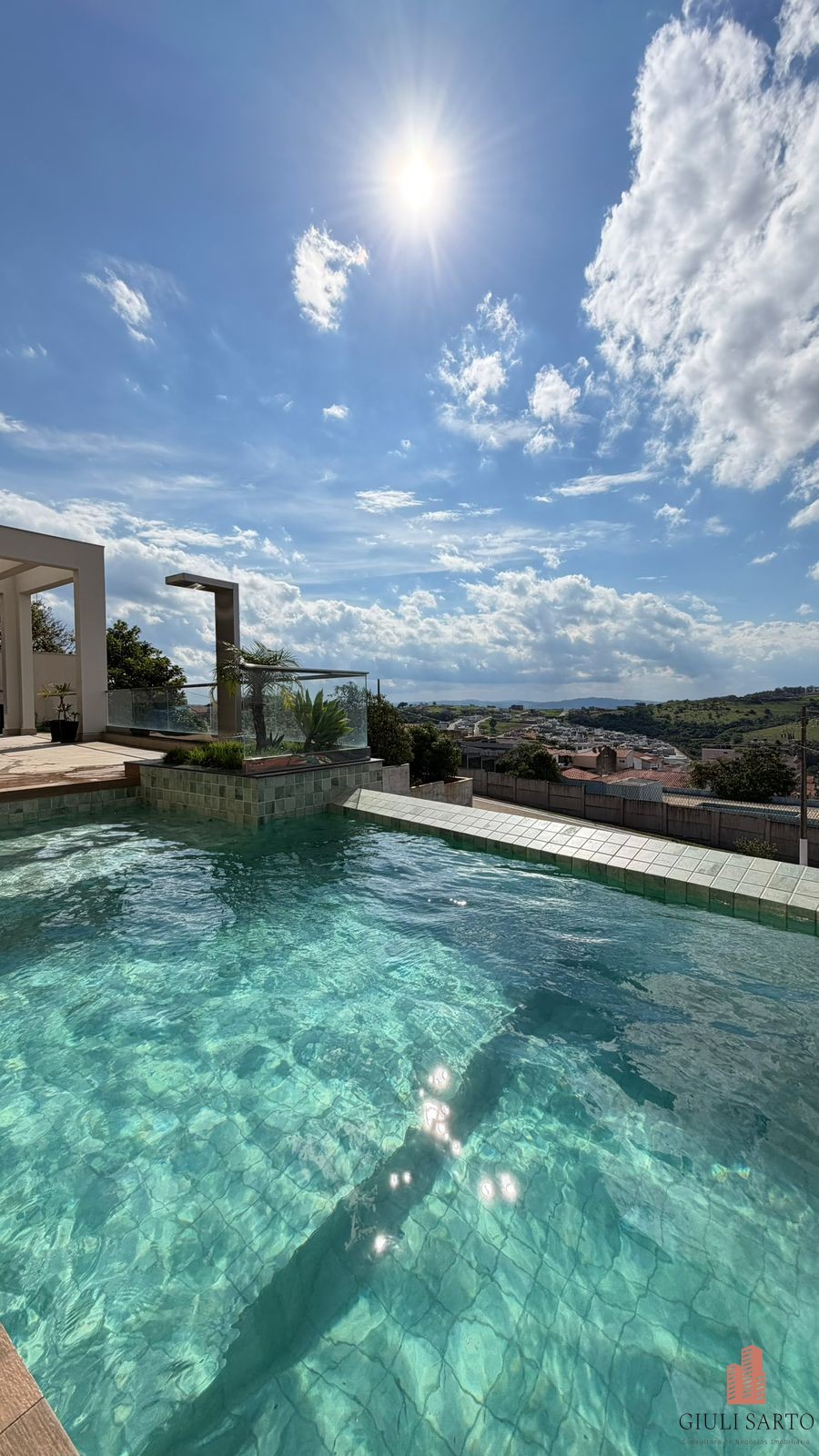 Piscina com cascata, sauna integrada, ducha e área livre com vista.