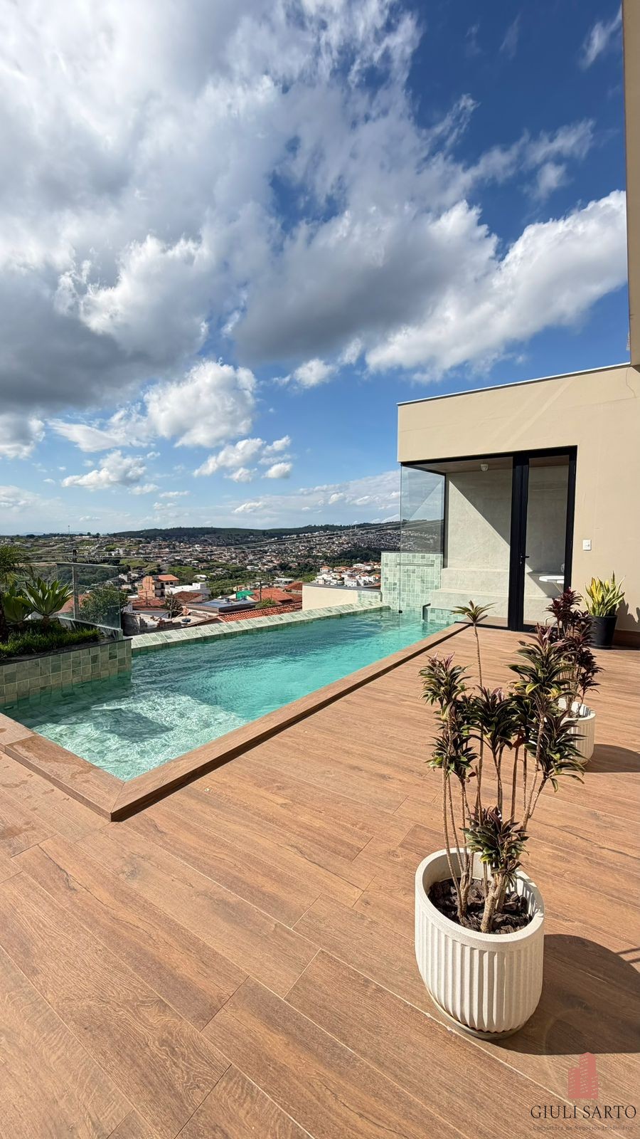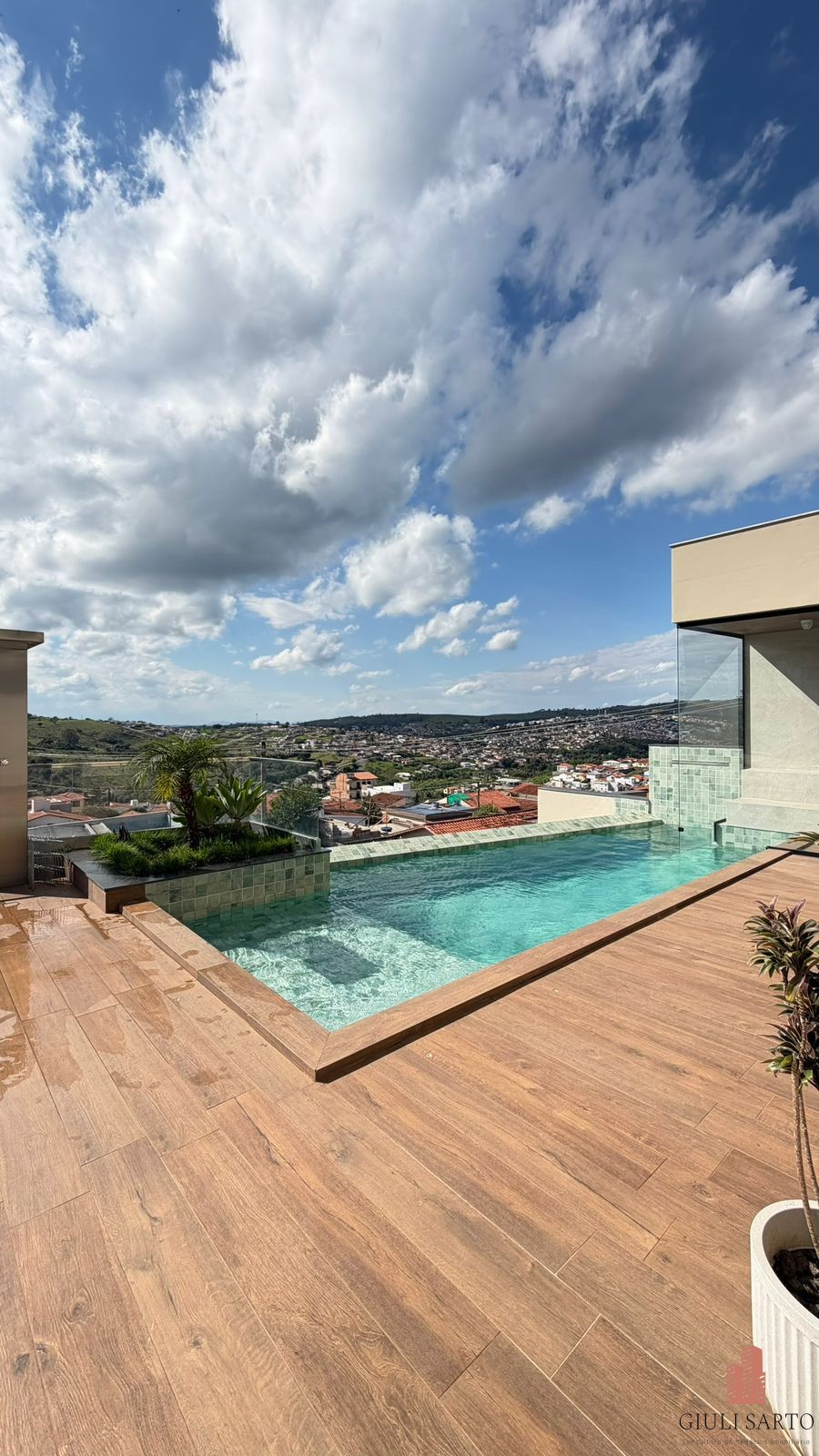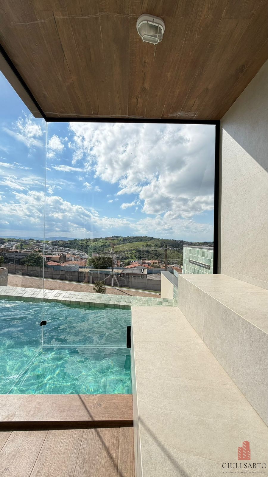 Piscina com cascata, sauna integrada, ducha e área livre com vista.
