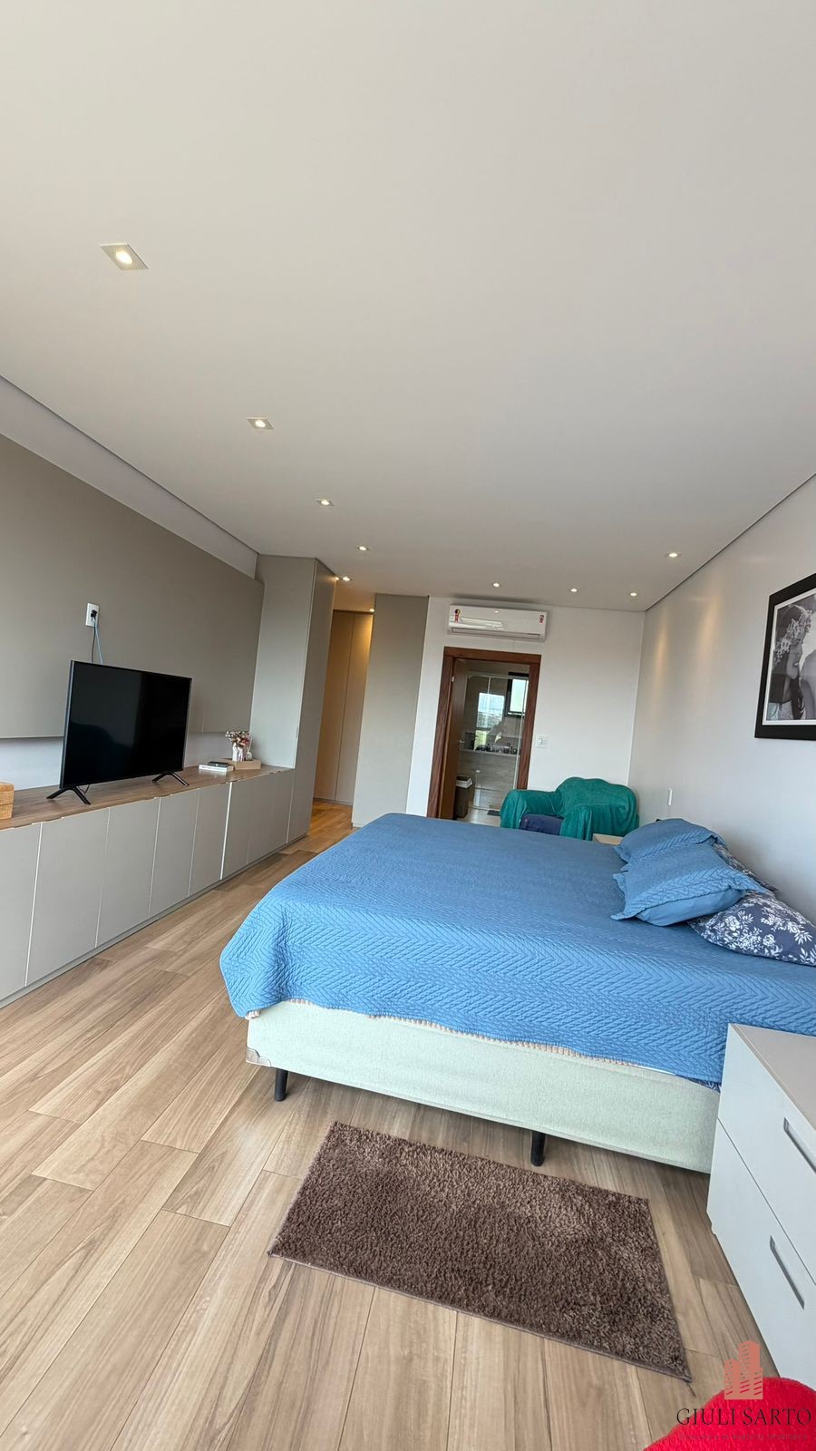 1 suíte planejada com ar-condicionado. Banheiro social com pia externa.